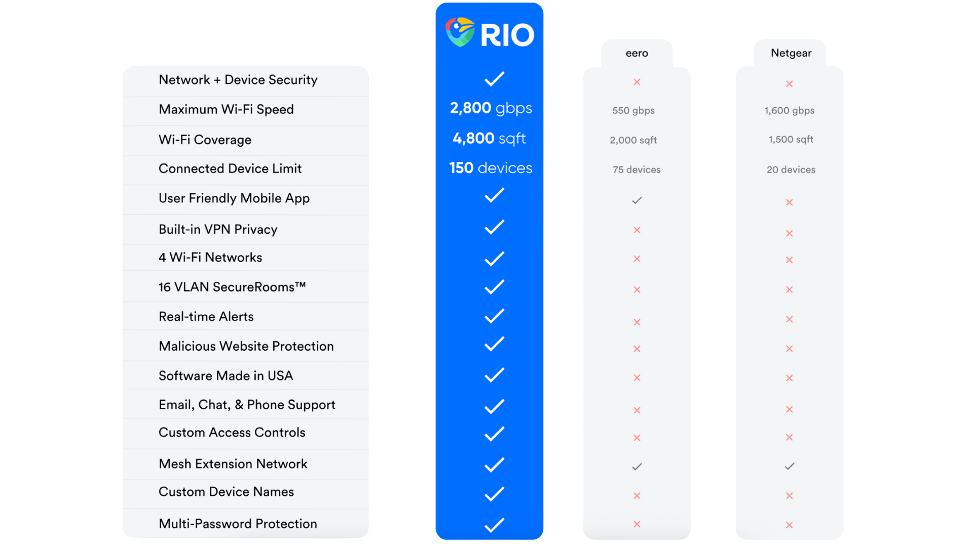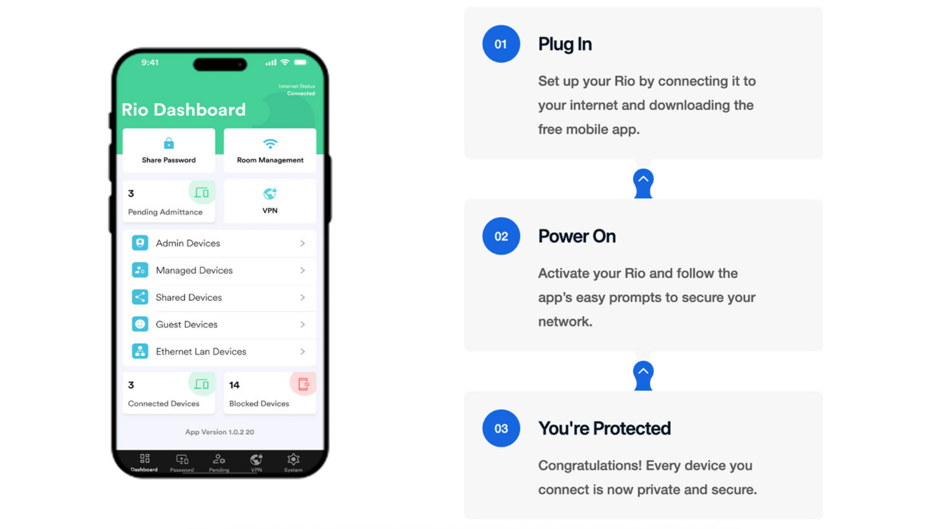 Rio est le premier routeur de cybersécurité tout-en-un qui combine des vitesses Wi-Fi 6 ultra-rapides avec un VPN intégré, une protection contre les menaces et des contrôles parentaux - le tout sans nécessiter d'abonnements mensuels.